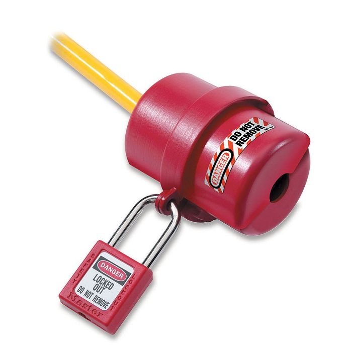 The Master Lock No. 487 Rotating Electrical Plug Lockout Device accepts cords with up to 3/4in (19mm) diameter and an electrical plug up to 2-1/4in (57mm) diameter x 3-1/4in (82mm).