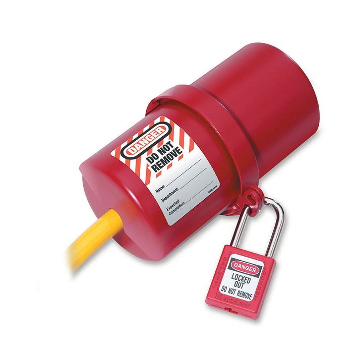 The Master Lock No. 488 Rotating Electrical Plug Lockout Device accepts cords with up to 3/4in (19mm) diameter and an electrical plug up to 3in (76mm) diameter x 6in (152mm).