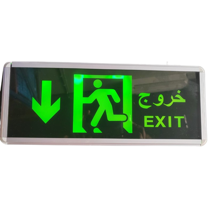 Aluiminium sliver frame and glass with down arrow (Exit) in both languages Arabic & English single side with chain