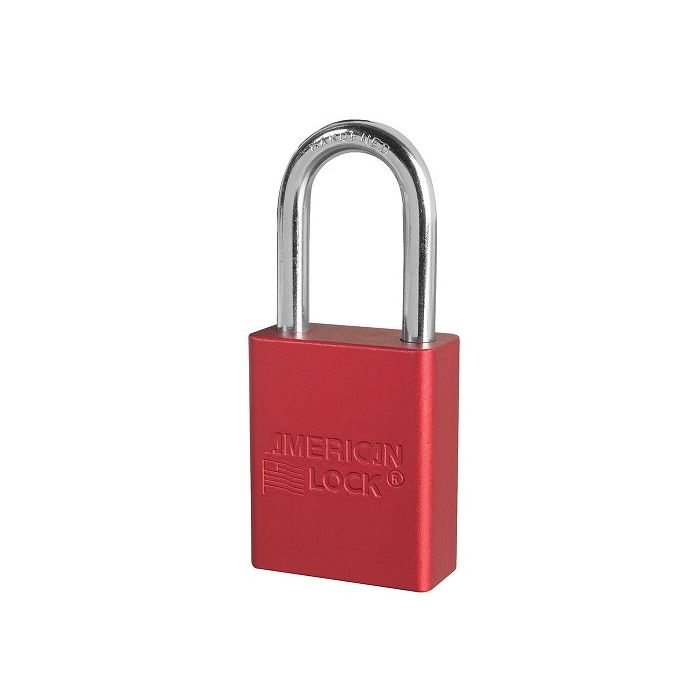 The American Lock No. A1106RED Aluminum Padlock features a 1-1/2in (38mm) wide red anodized aluminum body with a 1-1/2in (38mm) tall, 1/4in (6mm) diameter chrome plated, boron alloy shackle for superior cut resistance.