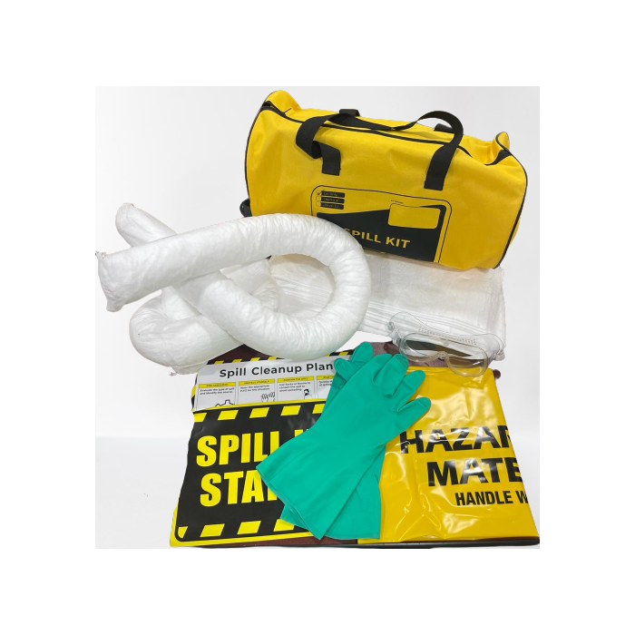 10 Pcs- Oil only absorbent pads (melt-blown) 2 Pcs - Oil only absorbent socks, medium size. 1 Pc – Hazmat waste disposal bag and tie. 1 Pc - Safety Goggles, Splash Proof 1 Pair – Nitrile Safety gloves 1 Pc – Spill control instruction guide 1 Pc - Spill Station Warning Sign 1 P – Spill Kit carry / storage bag (Yellow)